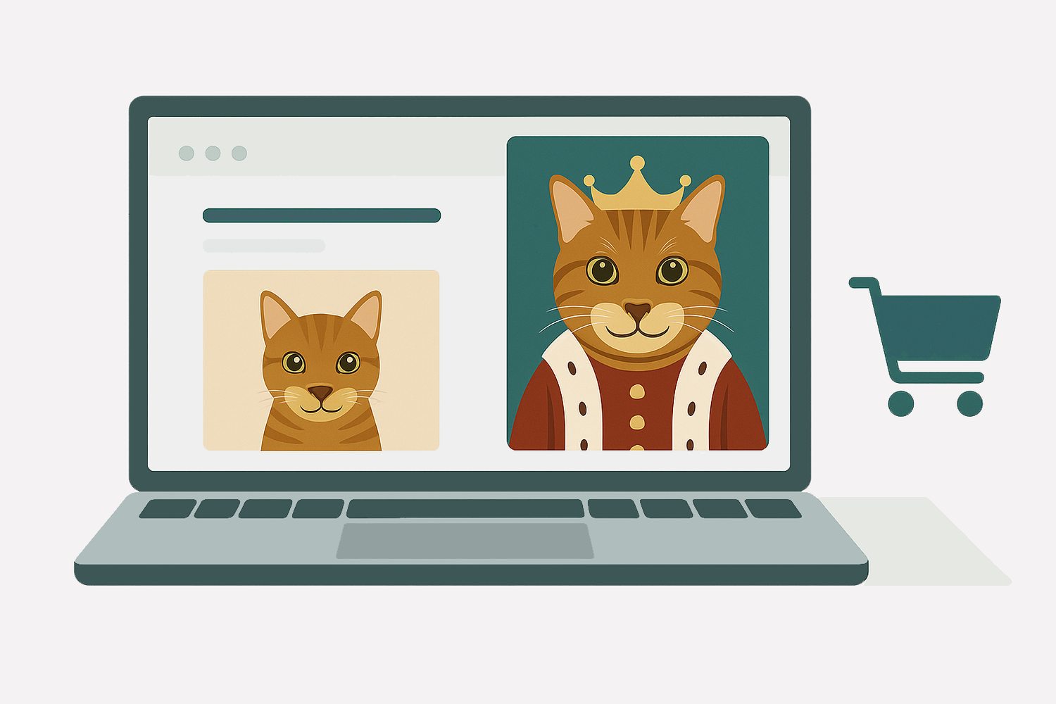 Naviguez parmi les différentes catégories proposées sur le site et choisissez le visuel qui sublimera votre animal. Sélectionnez le type de produit : toile, affiche, avec ou sans cadre, version numérique, etc... et la taille que vous souhaitez. Importez la photo de votre animal (n'hésitez pas à consulter le tutoriel photo) puis passez votre commande.